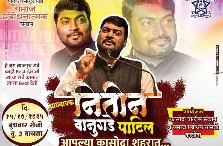 कासोदा येथे १५ ऑक्टोबर रोजी प्रसिद्ध व्याख्याते श्री.नितिन बानगुडे पाटील यांच्या व्याख्यानाचे आयोजन.